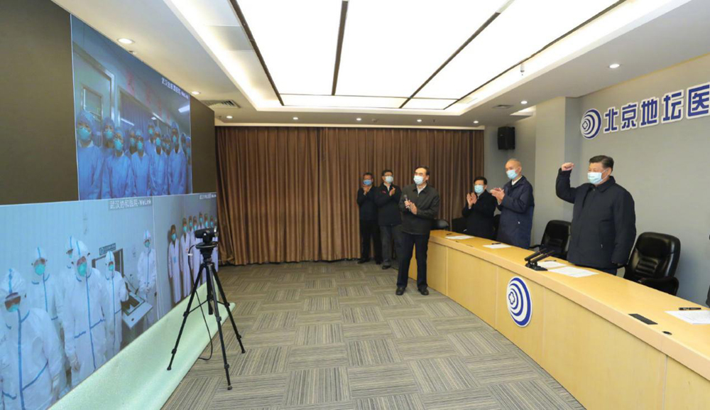 210日,习近平在首都医科大学附属北京地坛医院远程诊疗中心,通过视频连线武汉市收治新冠肺炎患者的金银潭医院、协和医院、火神山医院,了解情况、听取意见和建议,慰问一线医务工作者。