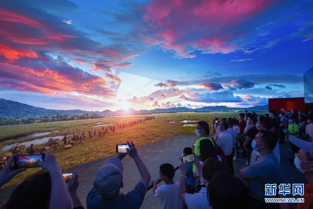 715日,观众在中国共产党历史展览馆“‘不忘初心、牢记使命’中国共产党历史展览”上观看红军长征过草地场景视频。新华社记者 陈晔华 摄