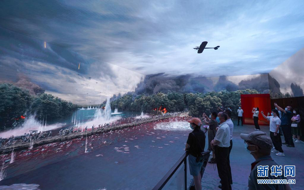 715日,观众在中国共产党历史展览馆“‘不忘初心、牢记使命’中国共产党历史展览”上观看湘江战役视频。新华社记者 陈晔华 摄