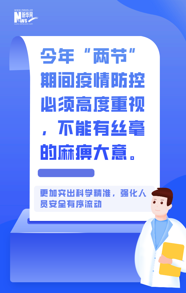 对于如何做好两节期间人员安全有序流动,国家卫健委疾控局一级巡视员贺青华提示,今年两节期间疫情防控必须高度重视,不能有丝毫的麻痹大意。要更加突出科学精准,强化人员安全有序流动,确保群众度过健康平安的节日。
