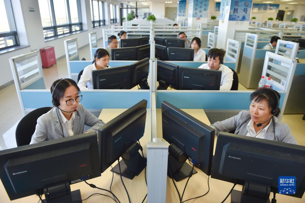 在位于北京亦庄的12345市民热线话务大厅,工作人员接听热线电话(2019年11月13日摄)。 新华社记者 彭子洋 摄
