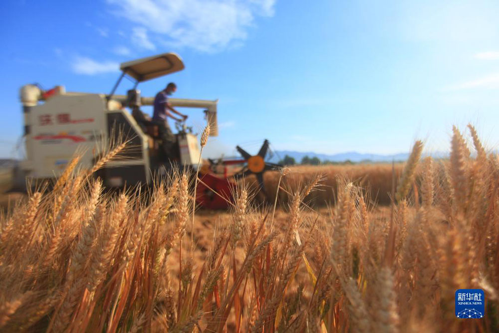 山东省临沂市平邑县农民驾驶收割机在田间收获小麦(2021年6月8日摄)。 新华社发(武纪全摄)