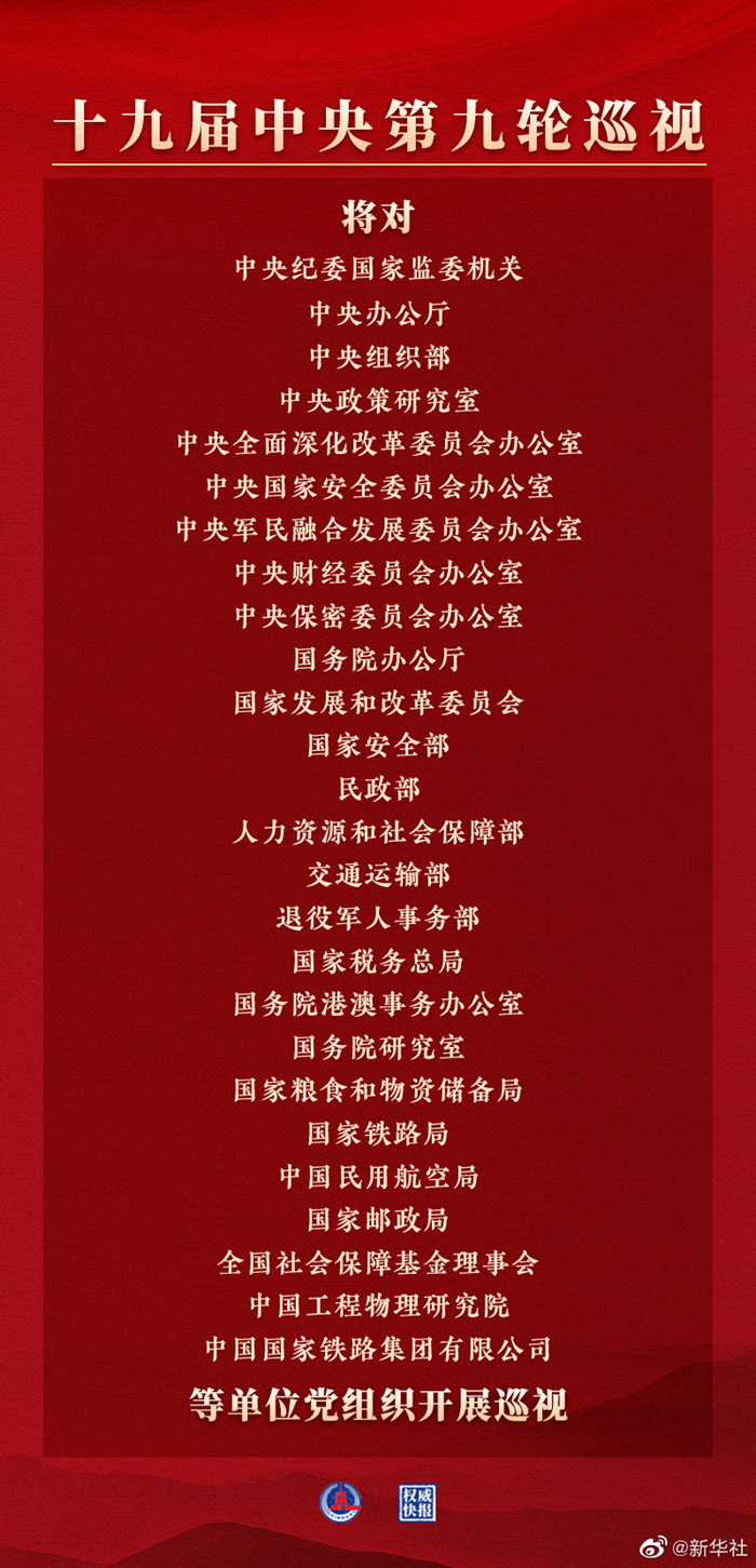 新华社北京323日电 经党中央批准,十九届中央第九轮巡视将对中央纪委国家监委机关、中央办公厅、中央组织部、中央政策研究室、中央全面深化改革委员会办公室、中央国家安全委员会办公室、中央军民融合发展委员会办公室、中央财经委员会办公室、中央保密委员会办公室;国务院办公厅、国家发展和改革委员会、国家安全部、民政部、人力资源和社会保障部、交通运输部、退役军人事务部、国家税务总局、国务院港澳事务办公室、国务院研究室、国家粮食和物资储备局、国家铁路局、中国民用航空局、国家邮政局;全国社会保障基金理事会、中国工程物理研究院、中国国家铁路集团有限公司等单位党组织开展巡视。