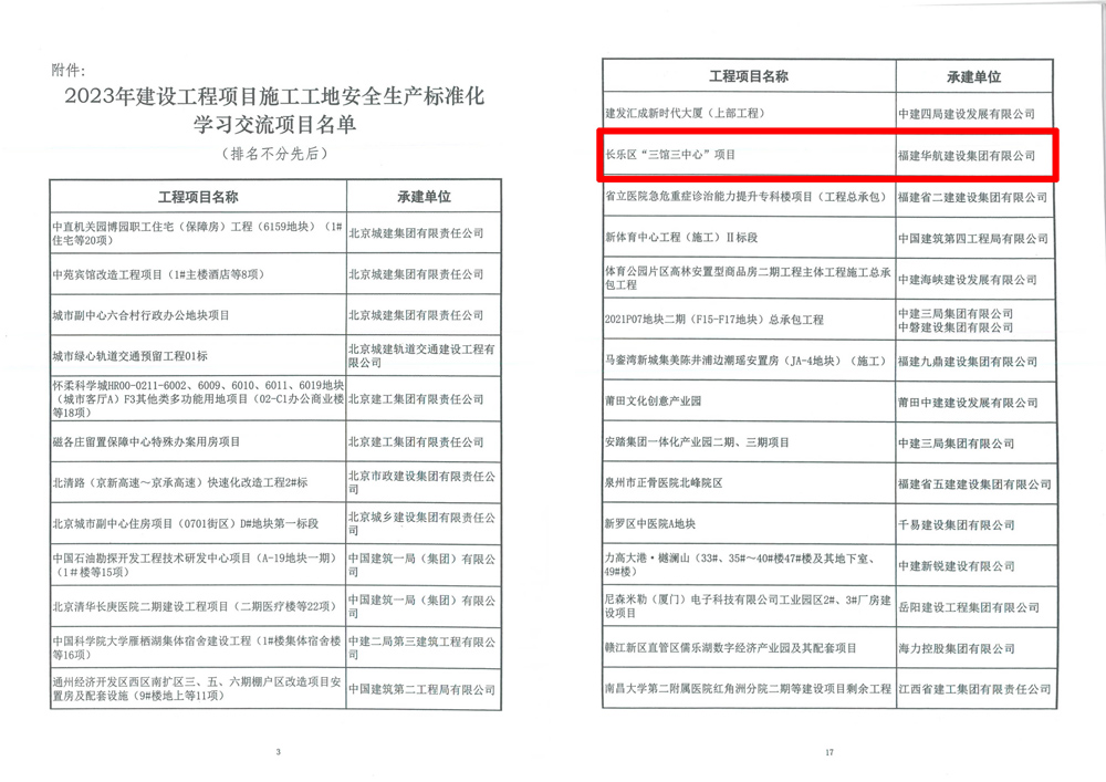 近日,中国建筑业协会建筑安全与机械分会公布了《2023年全国建设工程项目施工工地安全生产标准化学习交流项目名单》(原国家AAA级安全文明标准化工地),福建华航建设集团承建的长乐区三馆三中心项目(工程总承包)获评上榜!